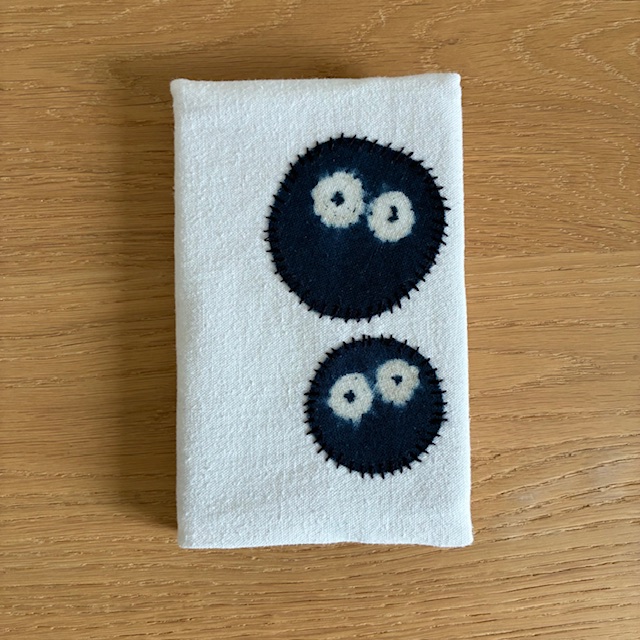 This A6-sized notebook (dimensions: 10x15 cm) is covered with a cotton sleeve, adorned with applications of small characters inspired by the Noireaudes. They are hand-dyed with natural indigo, using the Japanese Kasa-maki Shibori technique.