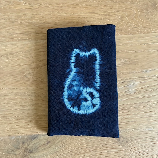 Ce carnet au format A6 (dimensions: 10×15 cm) est habillé d’une housse en coton teint à la main à l’indigo naturel, selon la technique japonaise du Nui-shime Shibori. Il arbore un adorable chat vue de dos.