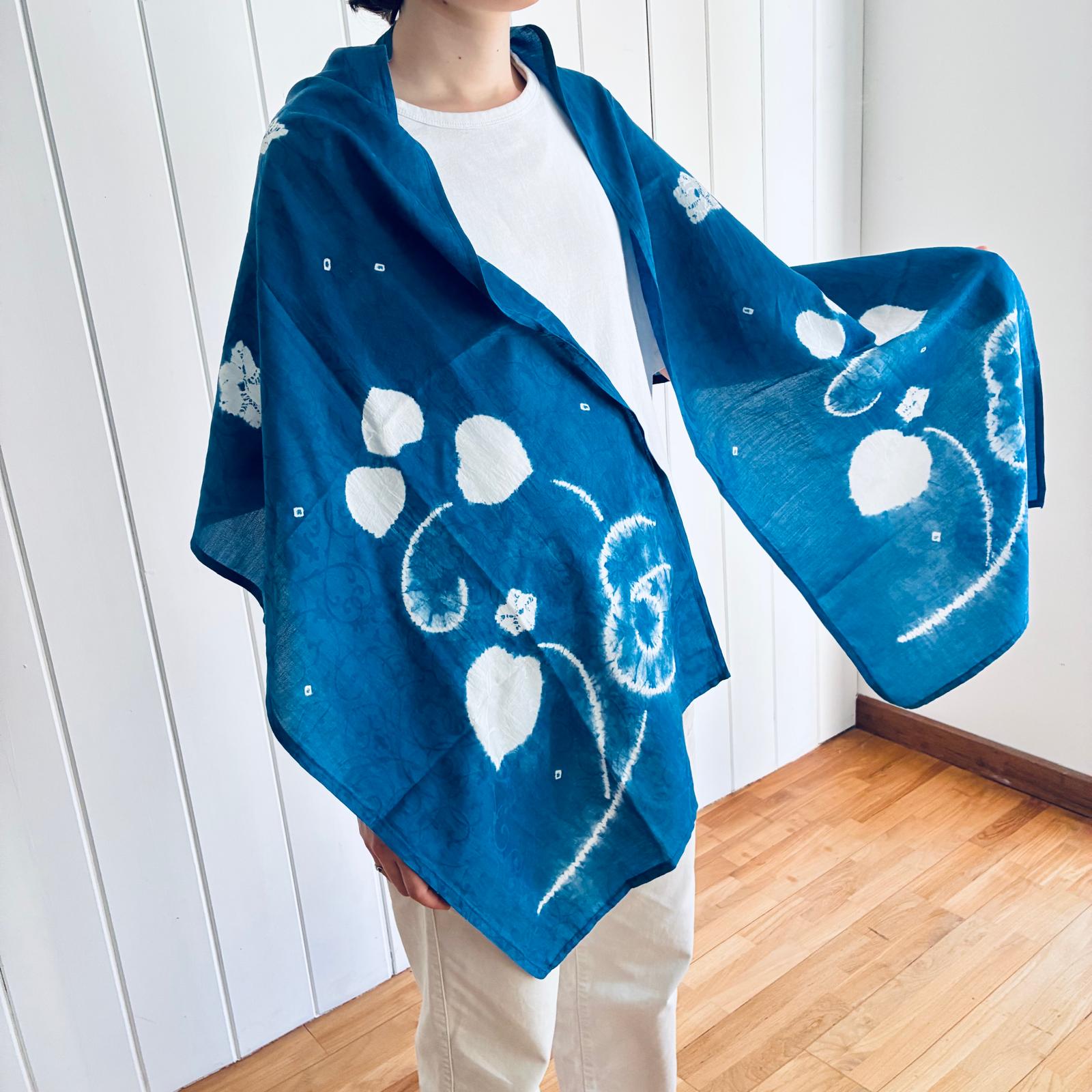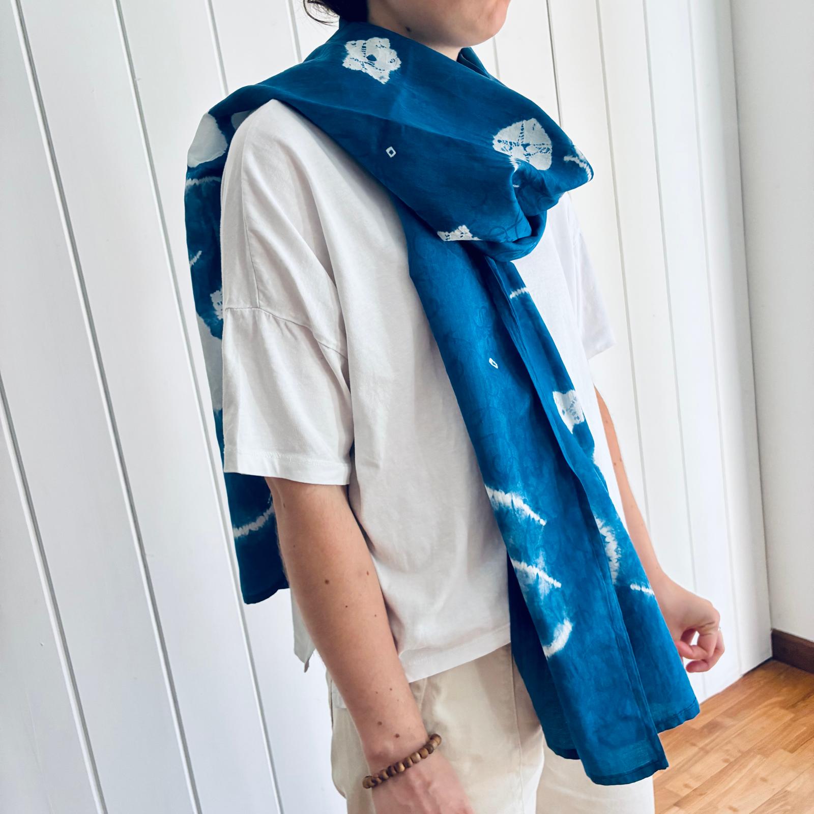 The scarf drapes easily, offering elegance and lightness, whether around the neck or as a clothing accessory, and invites contemplation of the delicacy of Shibori.