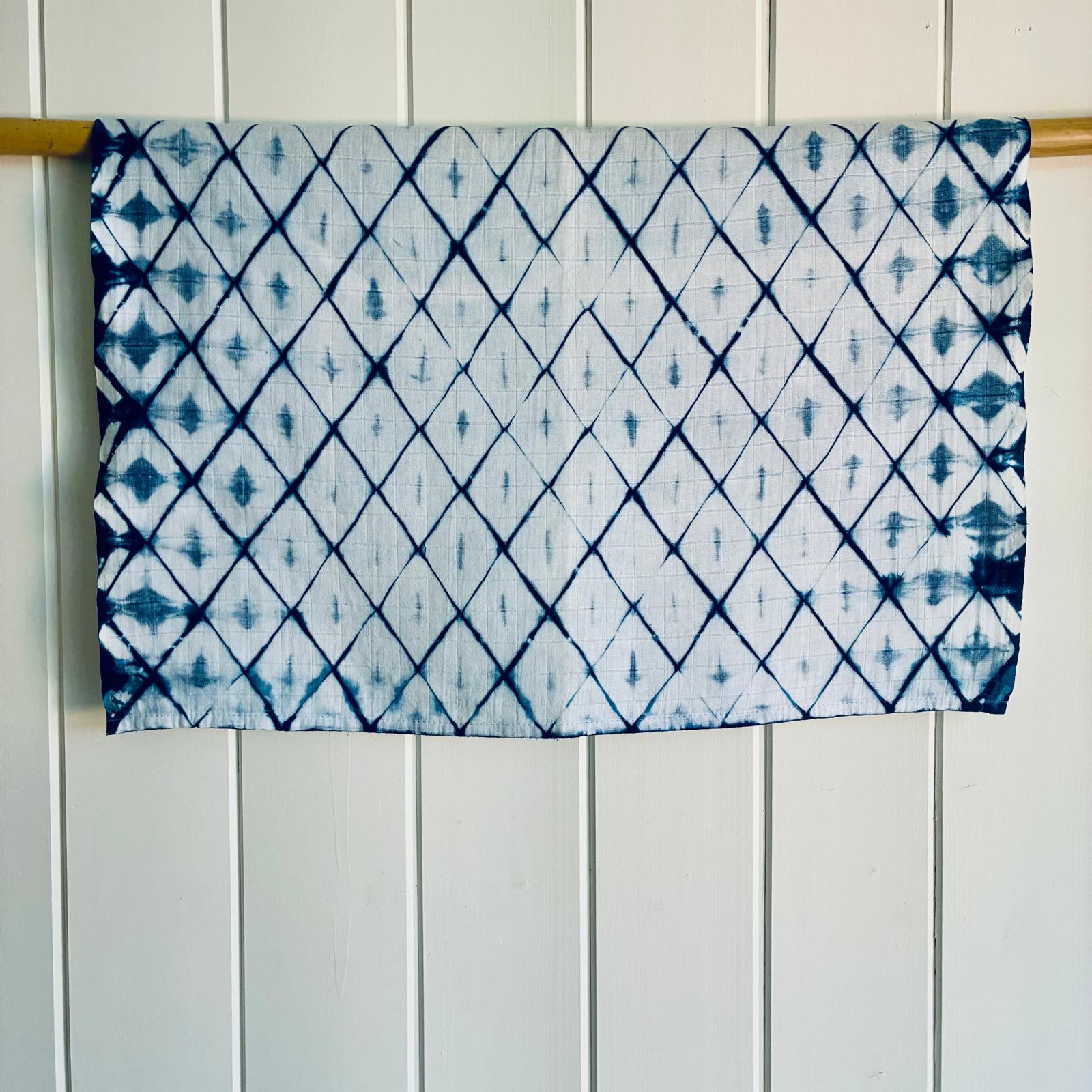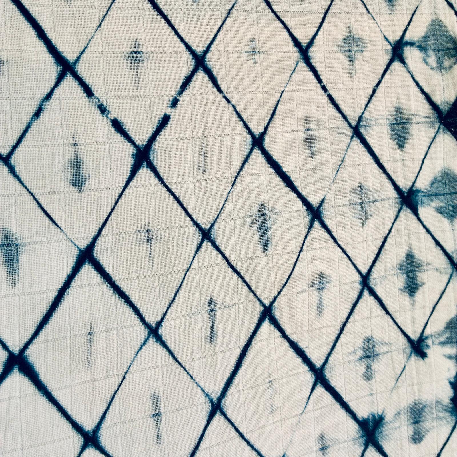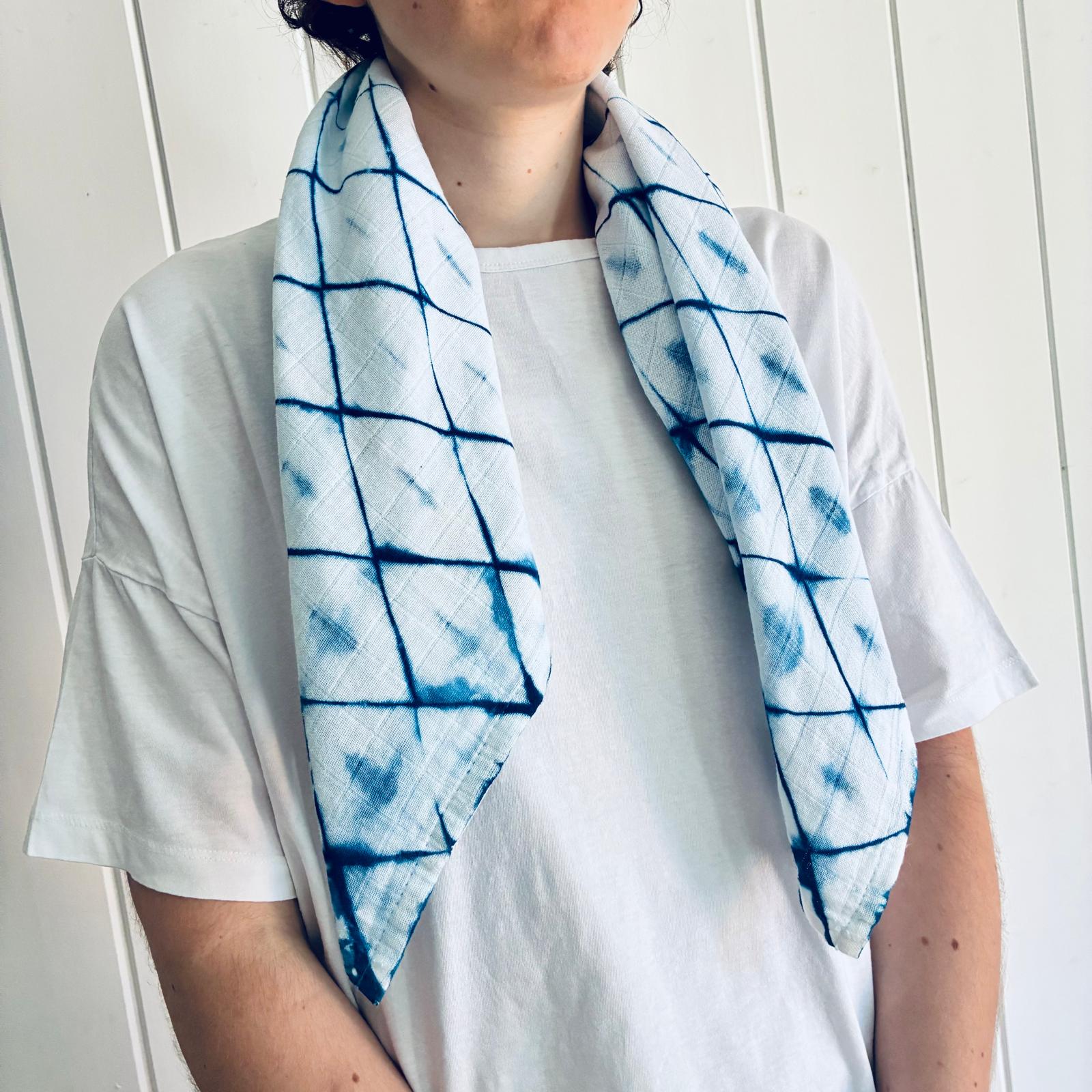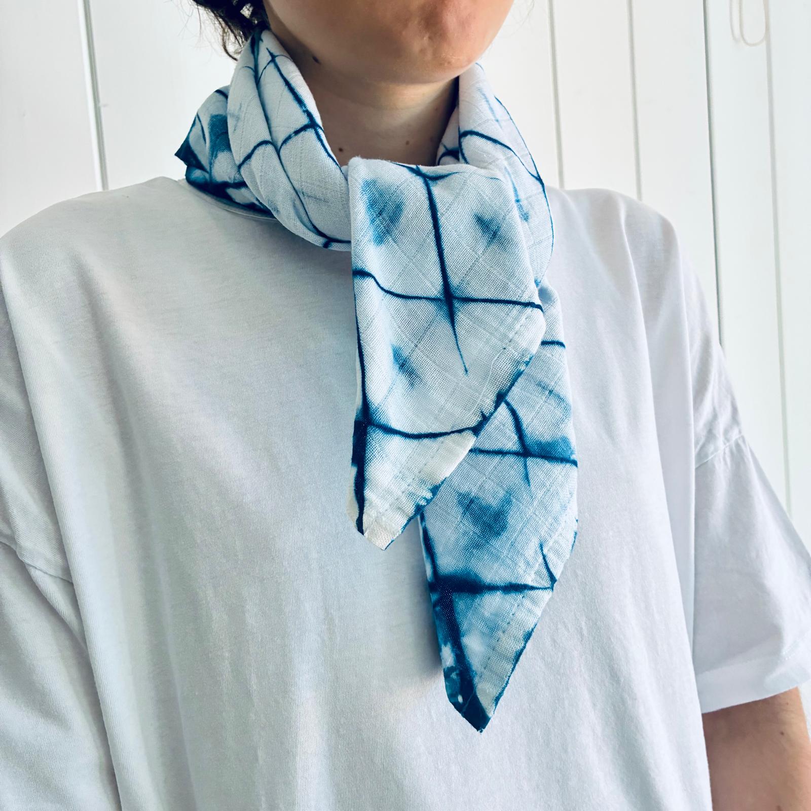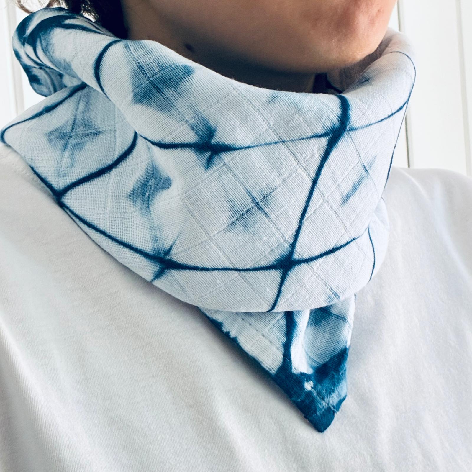 Réalisé entièrement à la main, il présente un motif Asanoha en Katano Shibori, créant un jeu subtil de géométrie et de textures sur le textile. La double-gaze épaisse confère douceur, tenue et confort au porté, tout en donnant au bandana une présence affirmée.