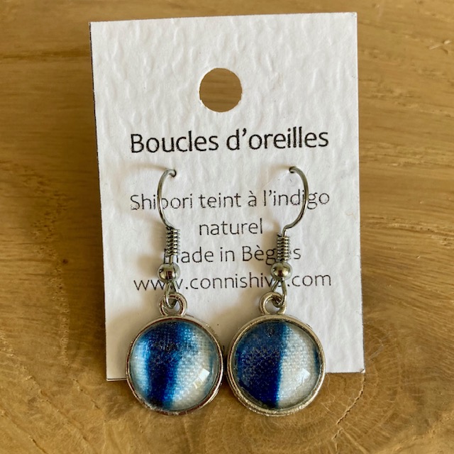 Ces boucles d’oreilles uniques allient élégance discrète et savoir-faire artisanal. Montées sur un support en acier inoxydable, elles sont à la fois légères, durables et agréables à porter tout au long de la journée. Leur charme réside dans le cabochon en verre qui protège et sublime un minuscule morceau de tissu teint à la main selon la technique traditionnelle japonaise du Shibori, avec de l’indigo naturel.
