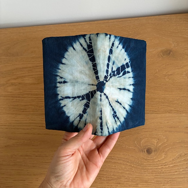 Ce carnet au format A6 (dimensions: 10×15 cm) est habillé d’une housse en coton, teinte à la main d’abord à l’avocat, puis à l’indigo naturel, selon la technique japonaise du Kasamaki Shibori.