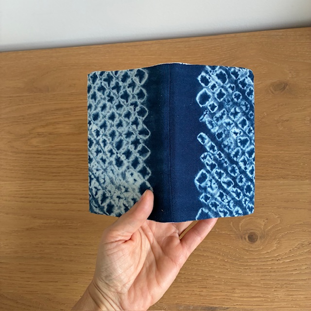 Ce carnet au format A6 (dimensions: 10×15 cm) est habillé d’une housse en coton teint à la main à l’indigo naturel, selon la technique japonaise du Miura Shibori.